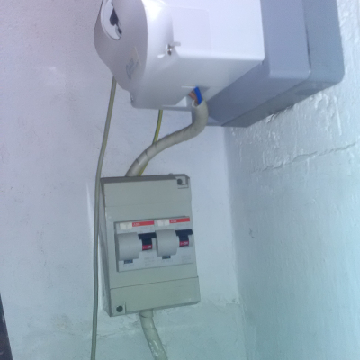 In basso: Sotto il contatore è installato un piccolo quadretto elettrico di protezione. Al suo interno ci sono due interruttori magnetotermici (marca ABB), che servono a proteggere la linea che va dal contatore al quadro generale dentro casa.